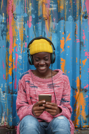 A black woman wearing a pink sweater is listening to music through headphones.