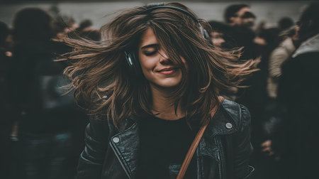 Smiling young woman in headphones with closed eyes in a midst of a blurred motion of a bustling crowd of a big city. The young woman radiates happiness, headphones on in the city crowd.