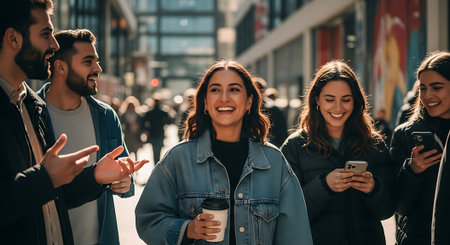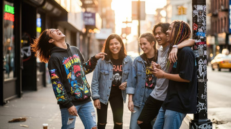 A diverse group of young adults is captured outdoors on a city street. They are seen laughing and interacting in a candid moment. The composition uses natural light. This image could be used for lifestyle content, promoting social connections, or illustrating concepts of friendship.