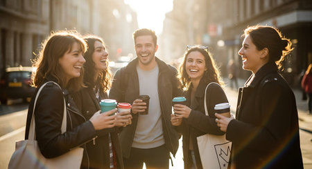 Group of friends walking in the city with coffee cups in their hands