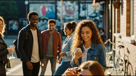 Group of young multiethnic people walking in the city and using mobile phone