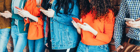 Phone. Close up of a group of young people with smartphones. Fri