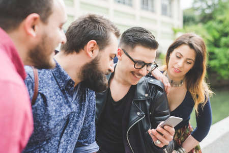 Multicultural hipster friends sharing content on smartphone at urban area in Shoreditch London - Millenial people and addictive fun with mobile smart phone - Technology concept on bright vivid filter