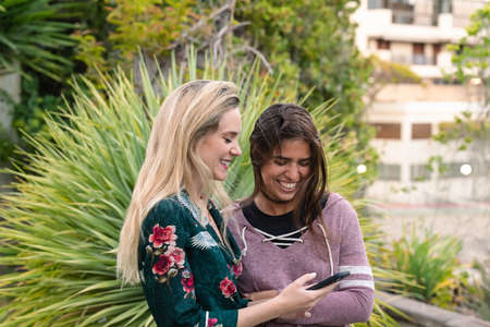 Couple of girls playing with the cell phone in the street