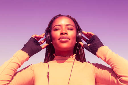 Closeup portrait of young afro woman smiling with headphones and purple background, pretty afro girl transmitting positivity and peace.