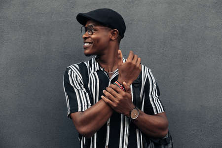 portrait of an African American man against a black wall, looking to the side, smiling broadly, wearing a shirt and shert, summer mood