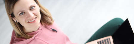 Portrait of smiling woman with a laptop on her legs