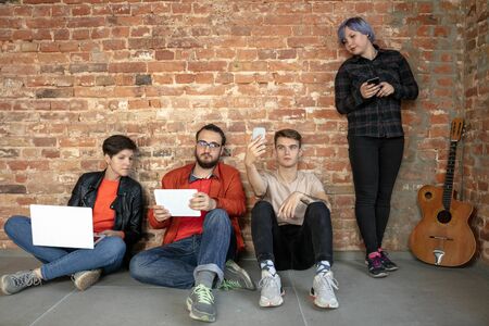 Group of happy caucasian young people behind the brick wall. Sharing a news, photos or videos from smartphones, laptops or tablets, playing games and having fun. Social media, modern technologies.
