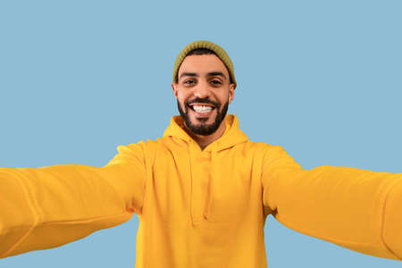 Happy middle eastern bearded man taking selfie, having fun, looking and smiling at camera, blue background