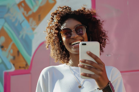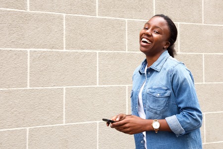 Portrait of young african woman holding mobile phone and laughing