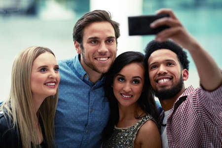 group of young people taking a selfie.