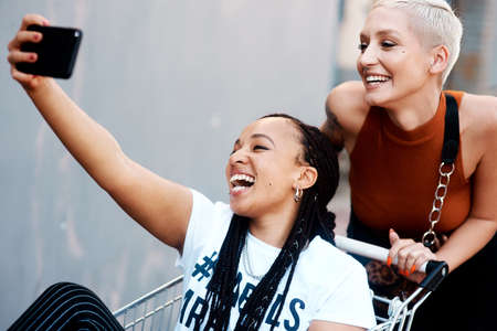 Happy would be an understatement. two cheerful young girlfriends taking a selfie while playing around with a shopping cart outdoors.