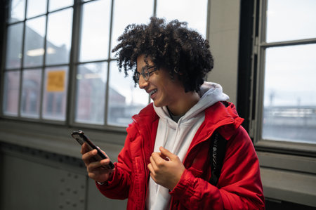 Curly-haired young guy in red jacket with a phone in hands