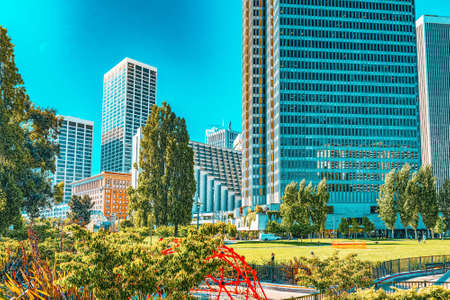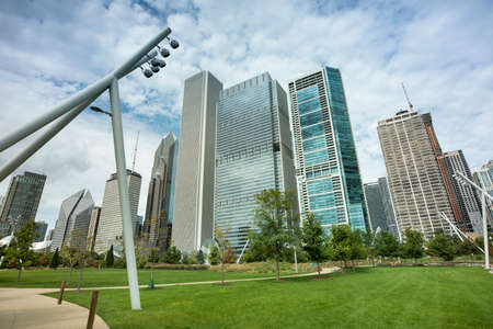 Autumn city park landscape. Cityscape with city park. Chicago high rises. Chicago cityscape skyline architecture. Skyscraper and landscape. Chicago cityscape. Chicago downtown city park and skyline