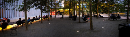 London, 3 June 2011: office workers enjoying the gorgeous summer weather at lunchtime, in London's financial district at the Docklands. Jubilee Park, Canary Wharf, Docklands, London. Landscape orientation.