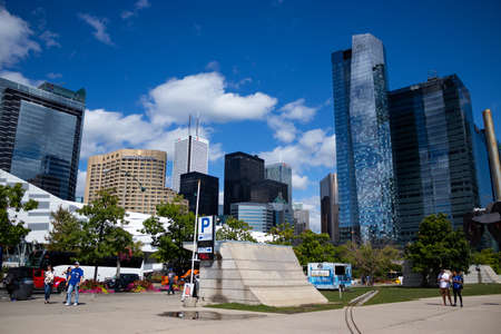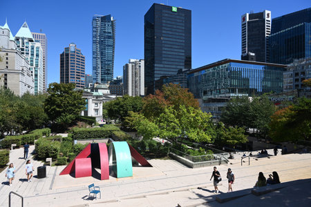 Montreal, Canada - August 11, 2025: View of Dorchester Square with trees, fountain, and modern skyscrapers in downtown Montreal