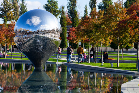 City Park Krasnodar or Galitsky Park. Beautiful trees and lawn on terraces of park. Sculpture Geolocation in the fall. Landscaping. Krasnodar, Russia - November 8, 2020