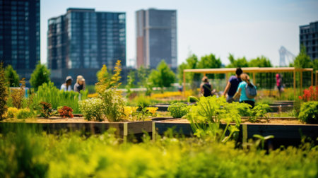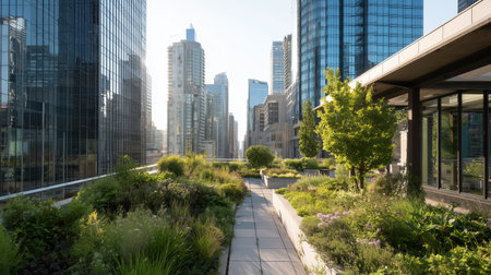 Green space on a rooftop garden in a city with tall buildings and clear sky