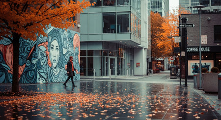 Stunning autumn cityscape featuring vibrant foliage framing modern skyscrapers under a blue sky. A perfect blend of nature and urban life.