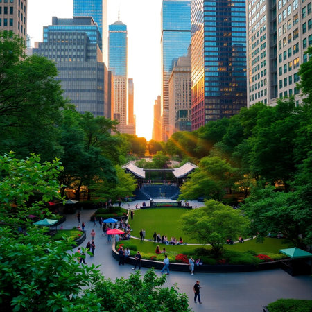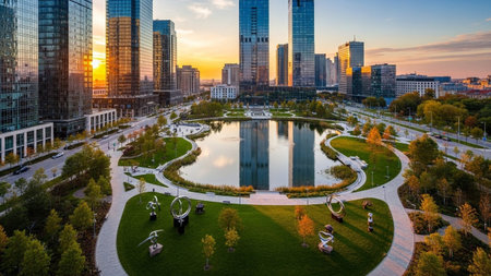 Golden showing aerial view of a modern city park with a pond, sculptures, green lawns, trees, and tall skyscrapers...