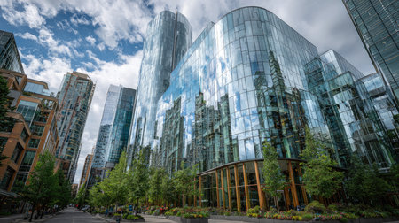 Stunning view of modern urban architecture featuring sleek glass buildings, framed by lush green landscaping and dynamic cloud patterns in the sky.