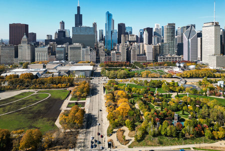 Chicago skyline with urban skyscrapers and fall foliage in Illinois, USA.