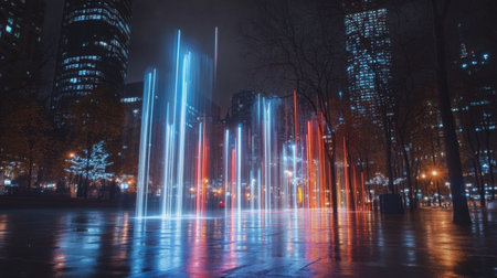 Stunning urban night scene featuring colorful light pillars that create a dynamic visual effect. Reflections on wet pavement enhance the atmosphere.