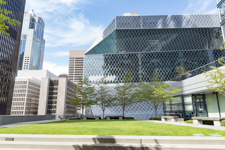 a view of Bellevue City Park in Washington State with skyscrapers in the distance..