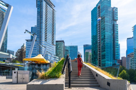 Businesswoman climbing stairs in a green urban space with skyscrapers in the background in Vancouver, British Columbia, enjoying modern architecture and a sunny day