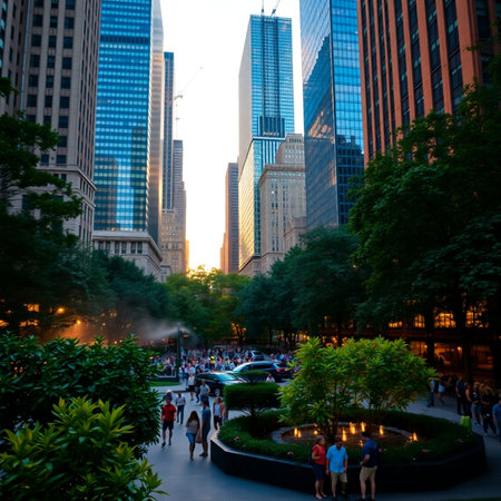 A vibrant city park filled with lush green trees and flowers, where people leisurely stroll along paved paths, juxtaposed against a backdrop of towering modern glass skyscrapers under a clear blue sky.