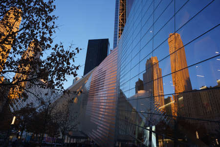 Financial district skyscrapers lit by setting sun reflecting in glass facade of 9/11 museum