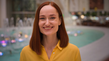 Close up portrait joyful girl Caucasian woman smiling dental toothy smile manager businesswoman female laugh customer shopper client looking friendly at camera indoor shopping mall shop store center