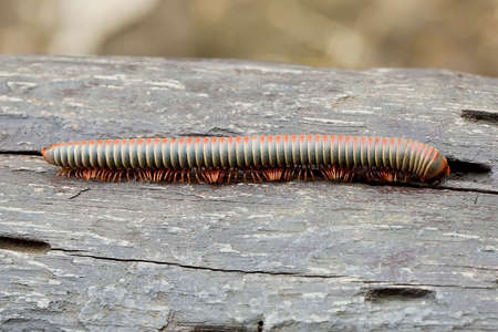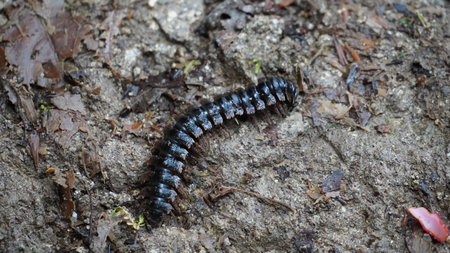 Millipede crawling on forest floor in autumn, macro shot. Nature and wildlife concept