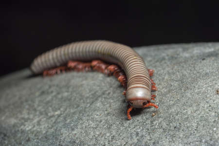 Closeup macro of black red legged millipede arthropod invertebrate bug insect Epibolus pulchripes Machu Picchu Peru