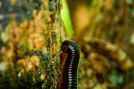 The Seychelles giant millipede on a tree branch (Sechelleptus seychellarum a member of Flatplate Millipedes Family Spirostreptidae)