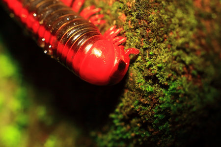 A poisonous centipede crawls in a row on wet leaves generated by artificial intelligence