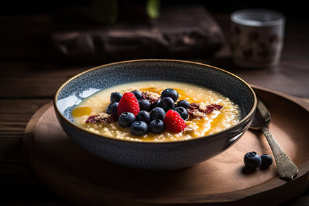 Millet Porridge, Healthy Cereal Breakfast with Fruits and Berries, Milk Millet Porridge on Dark Background, Abstract Generative AI Illustration