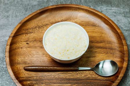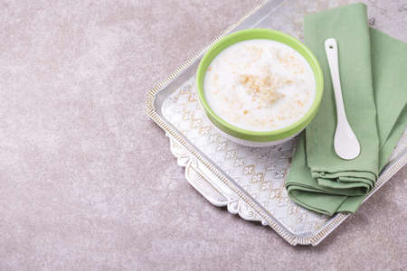 Brazilian sweet winter festival dessert Canjica. White corn porridge with cinnamon and coconut. Selective focus. Top view.
