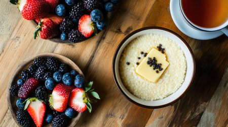 A warm bowl of grits with butter and honey, served with a cup of hot tea and fresh fruit slices.