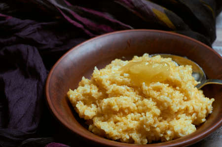 Porridge with rice and pumpkin with a spoon of honey in a clay plate with a hug of dark fabric close-up