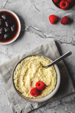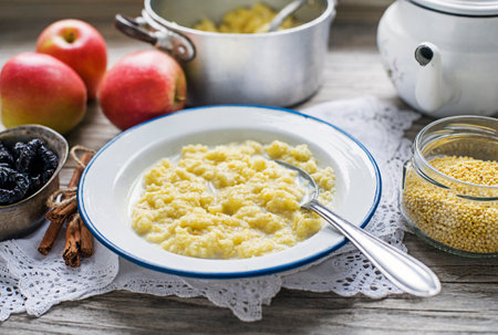 Millet Porridge with milk, prunes and Cinnamon, Tasty traditional Slovenian Breakfast