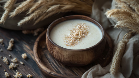Creamy millet porridge served in a rustic wooden bowl with garnish, surrounded by wheat stalks in a cozy kitchen setting