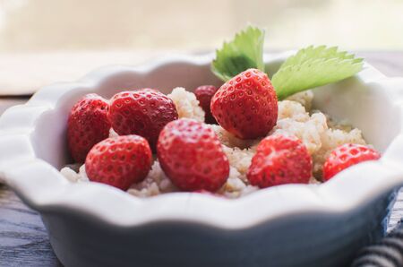 Breakfast. Tasty oatmeal with berries. Healthy breakfast ingredients. Oat granola in bowl with strawberry and mint. Granola for breakfast with berries.