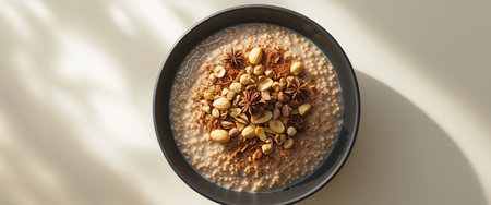 AI Generated. Millet porridge with nuts and spices in black bowls with copy space for food blog or recipe design