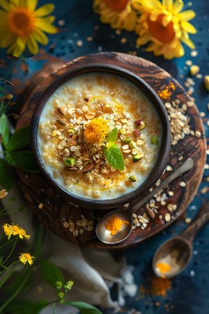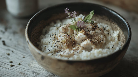 A beautifully crafted bowl of creamy rice garnished with fresh herbs and delicate flowers, showcasing a rustic charm perfect for culinary-themed visuals.