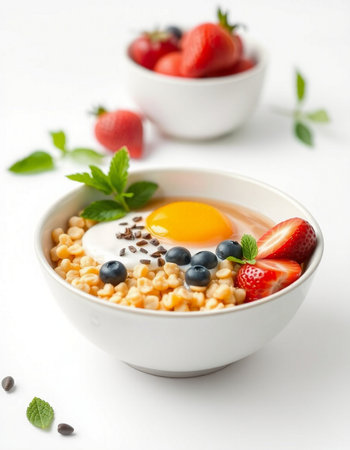 Bowl of oatmeal with berries and fried egg on white background