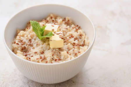 Bowl with tasty sweet oatmeal on light background