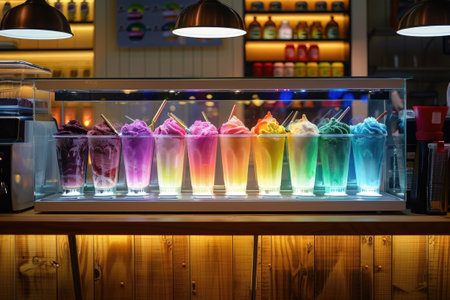 A bartender prepares cocktails surrounded by colorful neon lights in a lively bar during the night.