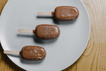 Cupcake ice cream with chocolate cream sprinkled with gold powder. Chocolate chip cookies in the form of ice cream on a plate. View from above