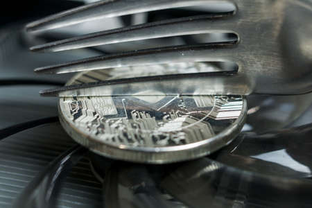Monero cryptocurreny coin placed on GPU graphic card and fork trying to half it, hard fork